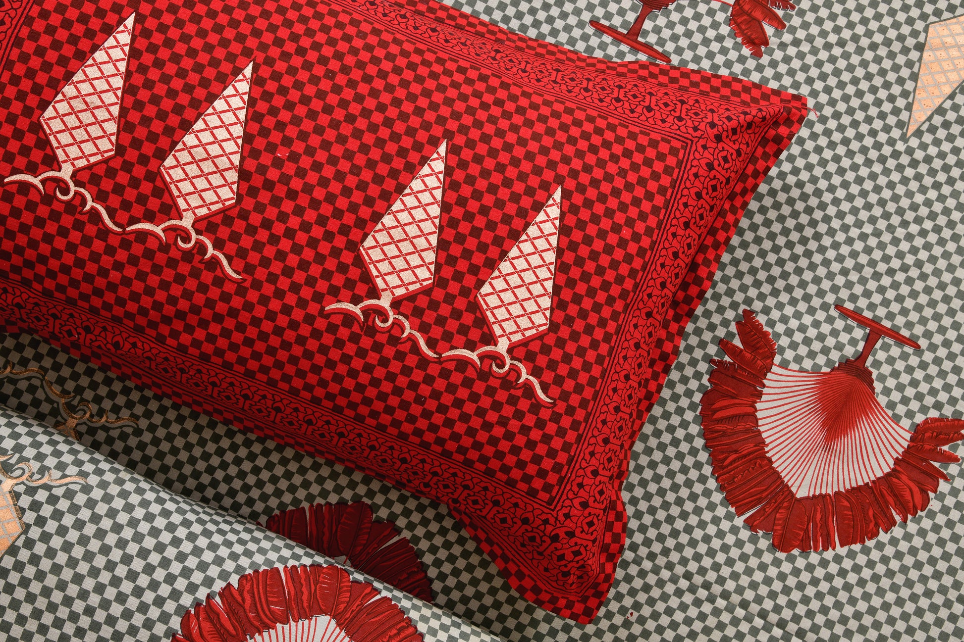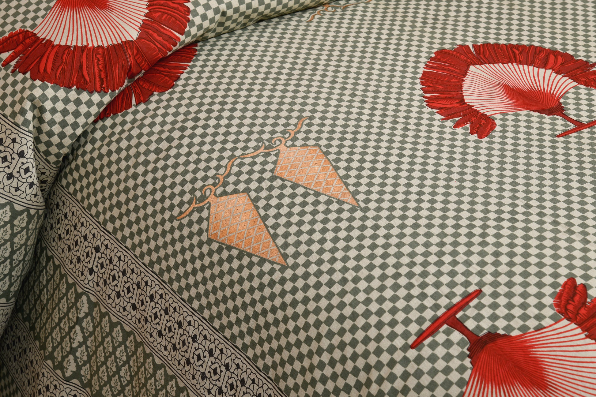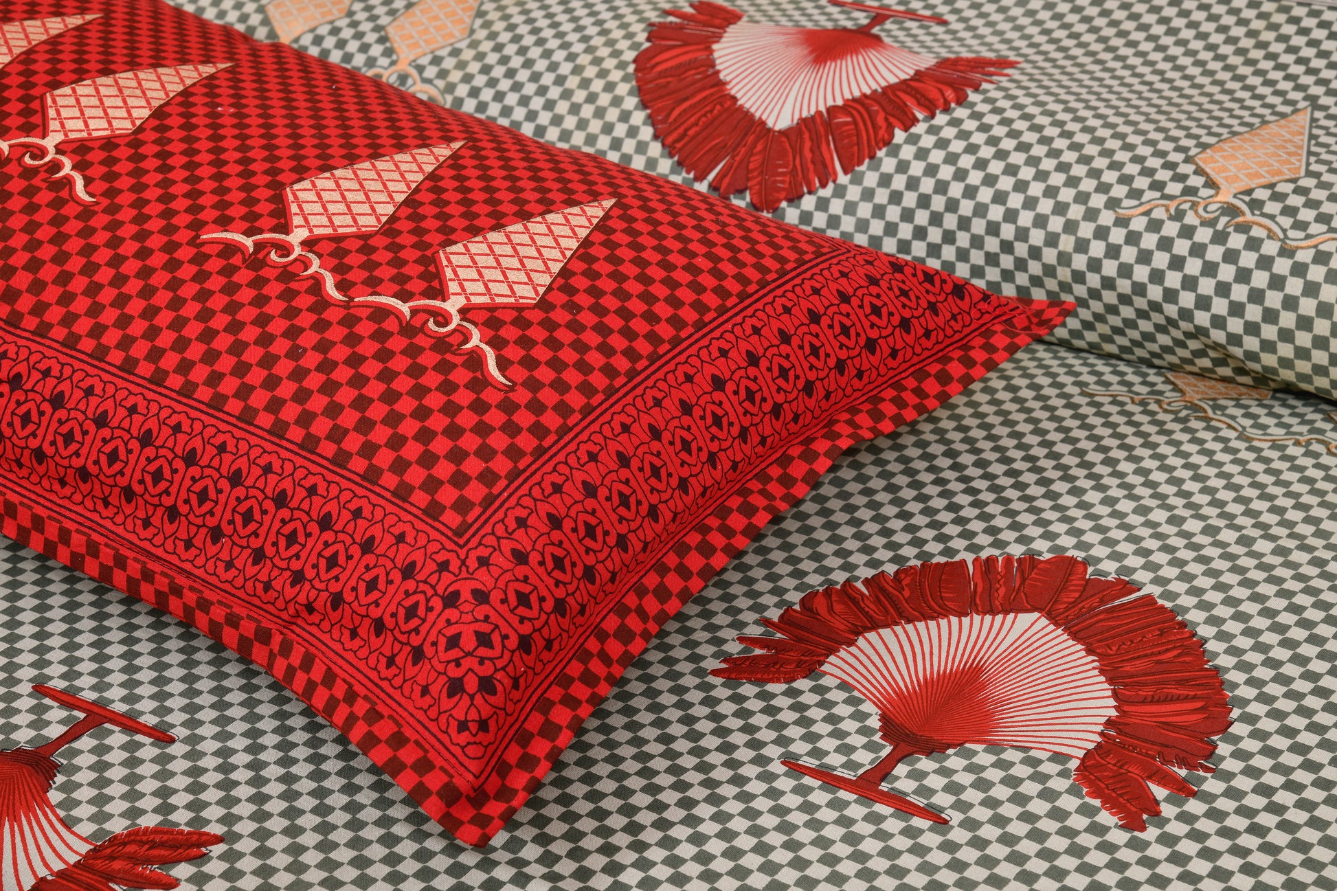 Celebrate heritage with a soothing sage check base lit by bold scarlet fan-florals, finished with lace-look borders for a handcrafted touch. Soft, breathable cotton keeps nights cool while the graphic motif and coordinated pillow shams add a festive, modern accent. Style it with wood tones or brass for an instantly elevated bedroom. Perfect for everyday luxury, guests, and gifting.