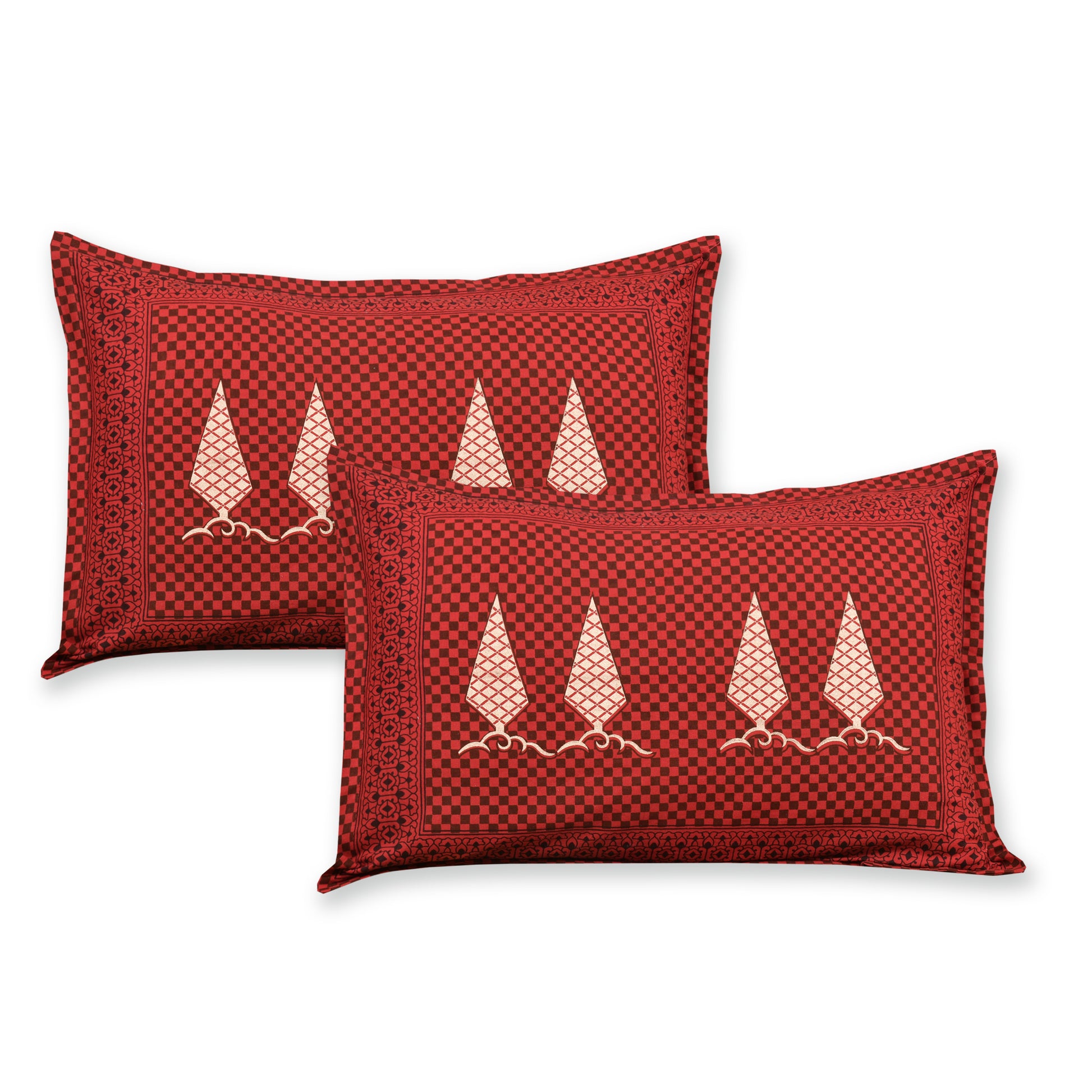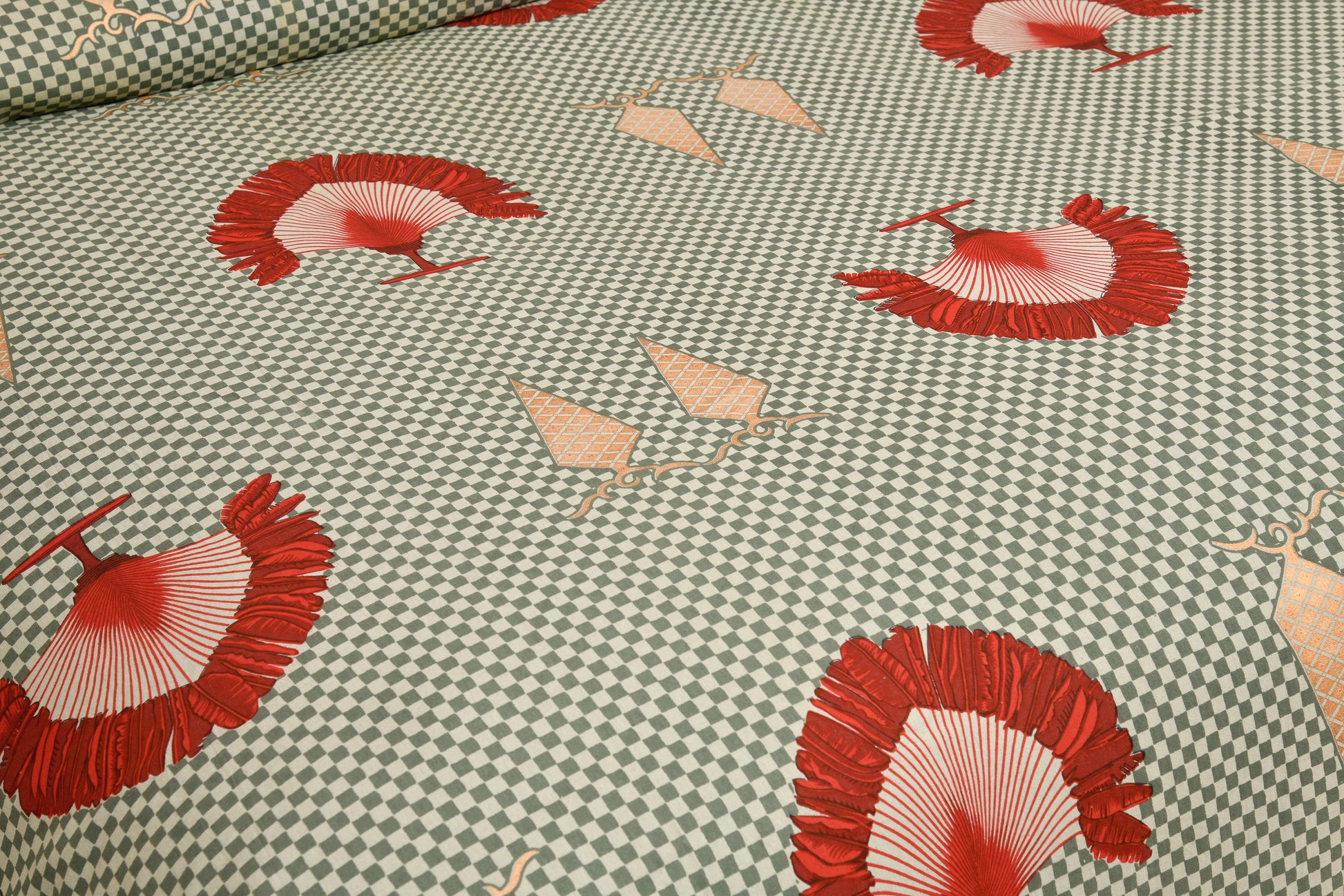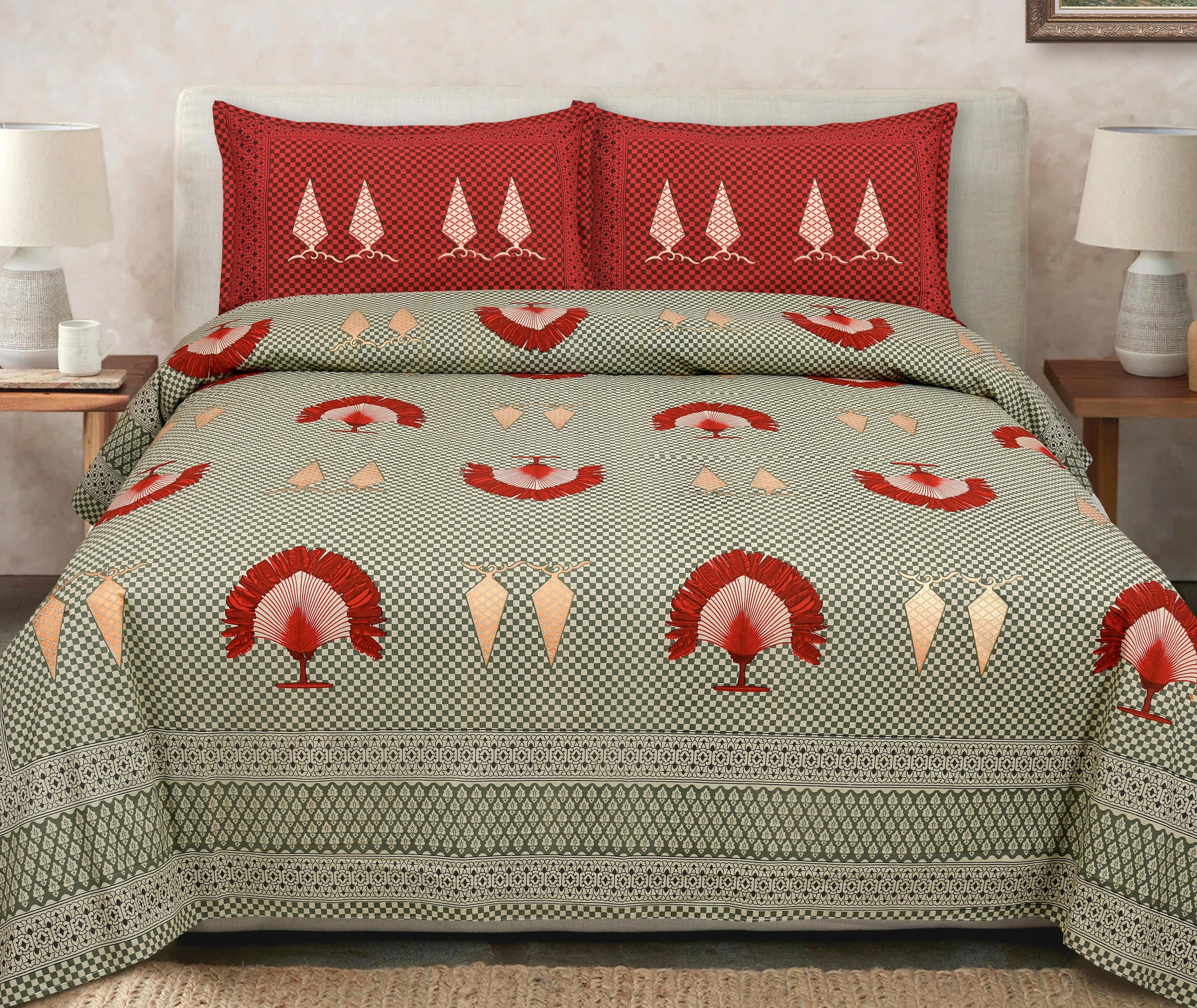 Celebrate heritage with a soothing sage check base lit by bold scarlet fan-florals, finished with lace-look borders for a handcrafted touch. Soft, breathable cotton keeps nights cool while the graphic motif and coordinated pillow shams add a festive, modern accent. Style it with wood tones or brass for an instantly elevated bedroom. Perfect for everyday luxury, guests, and gifting.