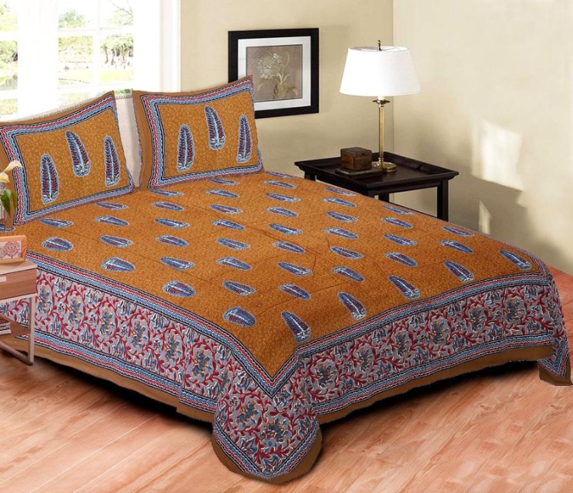 A handcrafted Jaipuri block‑print bedsheet featuring scattered paisley bootas on a textured field, framed with an ornate floral border for a rich, heritage look. Matching pillow covers carry framed motifs to create a neat, coordinated ensemble suited to both traditional and eclectic interiors.