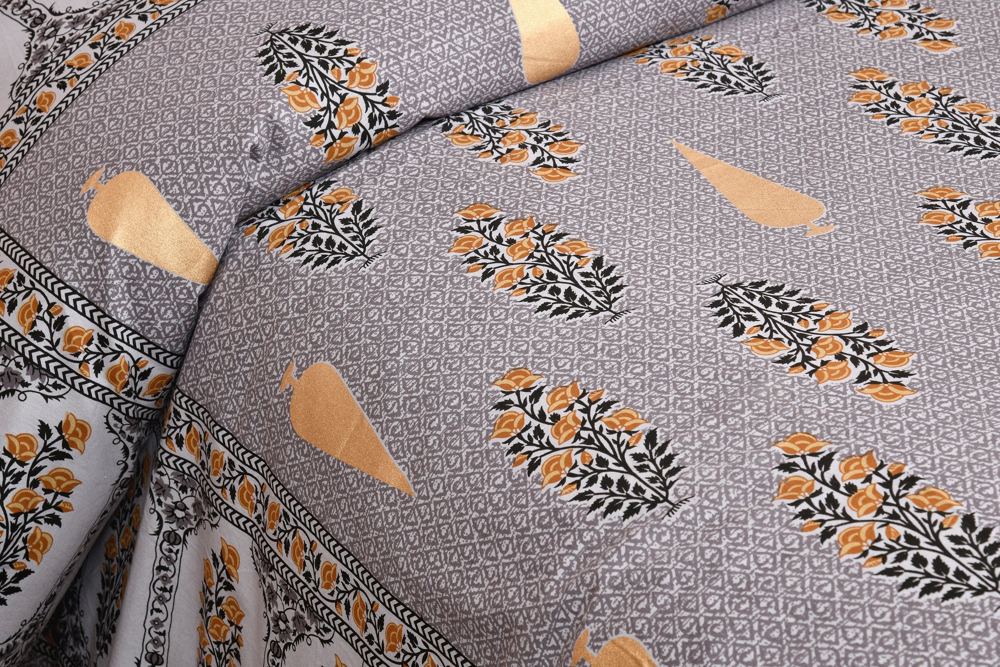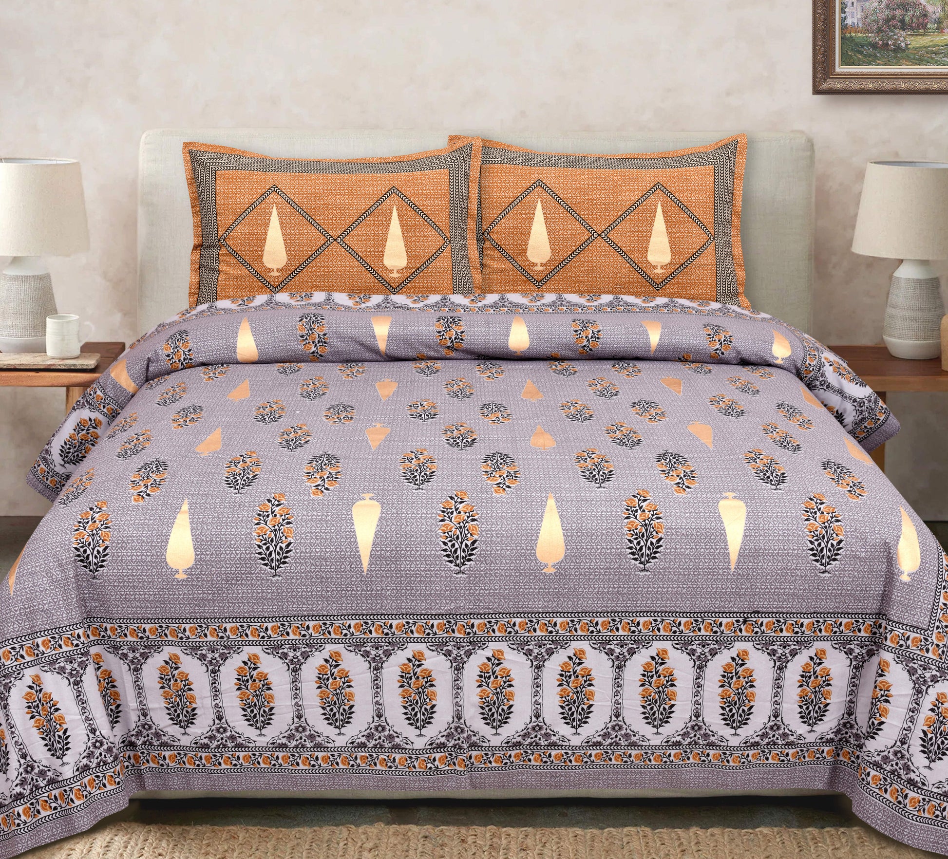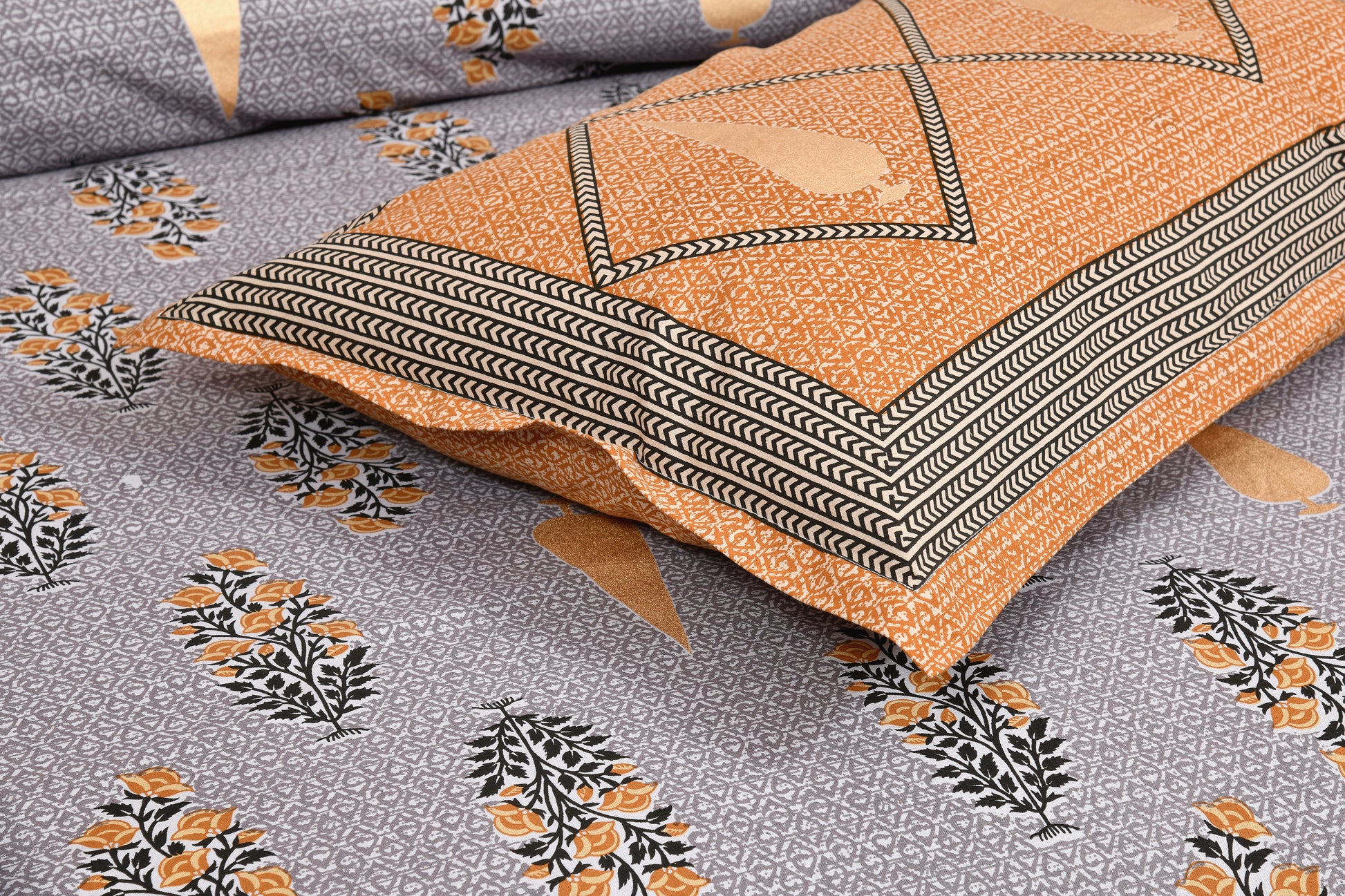 Elevate your room with this heritage‑inspired lavender‑grey bedsheet set highlighted with saffron‑ochre motifs and a framed border, crafted in soft, breathable cotton for year‑round comfort. The coordinated pillow covers feature a geometric panel that complements the floral buta and paisley accents, giving a rich, boutique‑hotel finish.